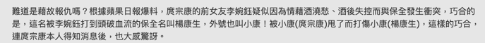 据说庹宗康为了分手使出“飙脏话、偷吃、搞失踪”三大绝招,李婉钰因为大受伤借酒消愁,还与楼下保安发生冲突。