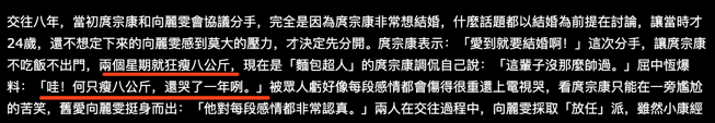 据说两人是因为结婚的事情谈崩,向丽雯害怕结婚,而康哥想要结婚,两人分手后庹宗康两星期狂瘦8公斤,屈中恒爆料他还哭了一个星期。