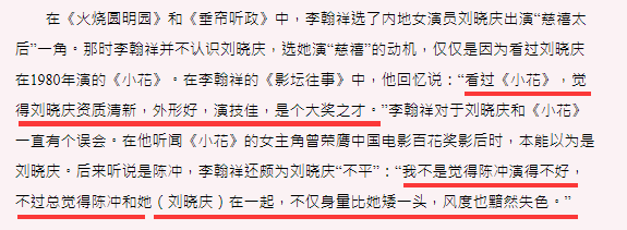认真做好功课,其次才是选角。李翰祥看过刘晓庆演的《小花》,在他看来,刘晓庆资质清新,外形好,演技佳,甚至身量要比《小花》女主陈冲还好。