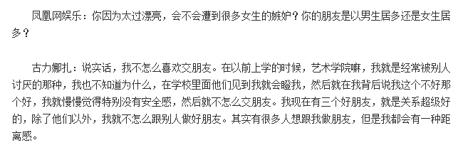 古力娜扎读新疆艺术学院附中,因为颜值高经常被同学排斥,朋友不多。让她决定离开新疆考北电的原因之一,也是因为她想逃离被排斥的环境。