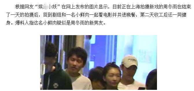 一年后周冬雨在三亚和男子在一屋内没拉窗帘被拍到,她才承认恋情,说对方叫田明鑫,是她的同班同学,大四时在一起的。