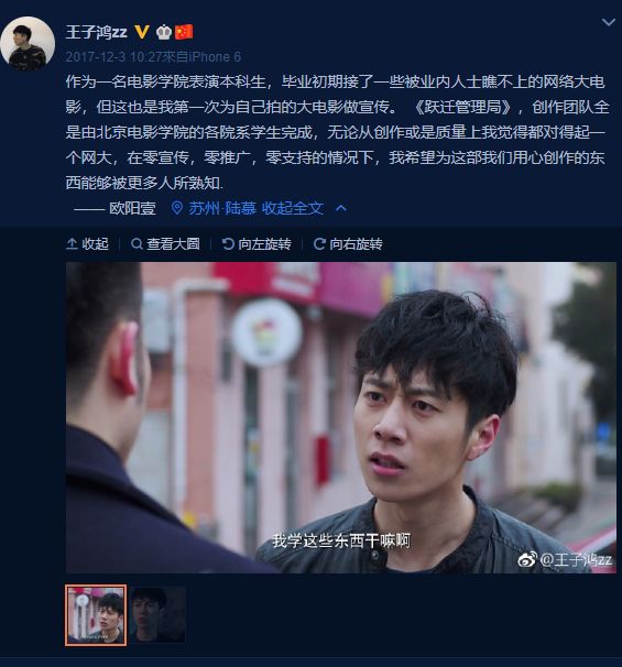他也曾给娜扎和周冬雨的《缝纫机乐队》宣传,说“我争取努力跟上你们的脚步”,但演的却是《火锅侠》之类的网大。