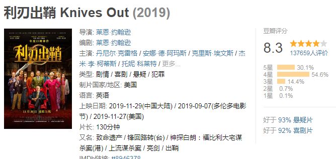 但今年好像有些不同,《利刃出鞘》不但同步上了,还入选了大部分媒体的十佳,感觉像是这帮媒体集体为这部片宣传似的。