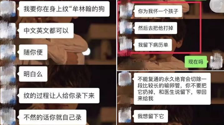 文中,牟某和包某的聊天记录显示,“处女情结”只是牟某用来贬低包某的一部分理由,更恶劣的侮辱还有“我要你在身上纹 牟XX的狗”,还要她为自己打胎绝育,并留下一截输卵管给自己做收藏。