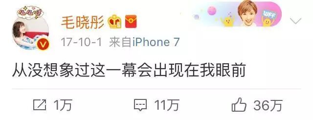 之后的事大家都知道了,2017年10月,毛晓彤突然发了一条耐人寻味的微博:“从没想象过这一幕会出现在我眼前”。