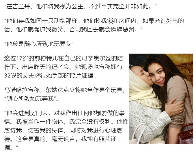 据她回忆,2007年她和母亲在一次晚宴上,认识了30岁的马来西亚王子,不久之后对方母亲就要她嫁入皇室,还说婚礼都安排好了,至少走个仪式再走。