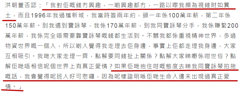 对于自己被嘲软饭男,洪朝丰再爆金句:“我一向都视钱财如粪土”,还说指责他的人很可悲:“证明他们生命里未出现过真正的爱情。”