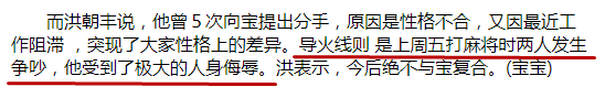 宝咏琴哭着说自己是被分手的,交往时洪朝丰情绪起伏很大,自己已经是尽量迁就;洪朝丰则说是性格不合,打麻将时被宝咏琴人身侮辱了,扬言绝不复合。