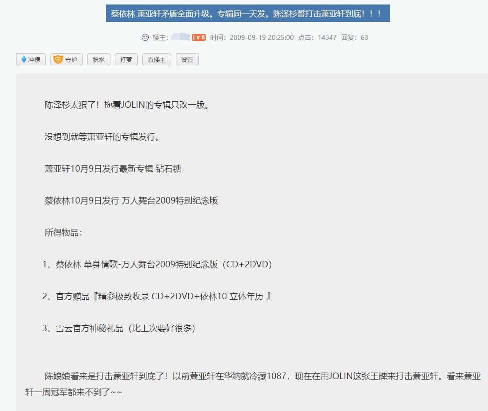 当时很多明星都爱发专辑庆功版、纪念版,有粉丝发现,蔡依林的专辑拖着不改版,等到萧亚轩发新专辑,偏偏同天撞个正着。