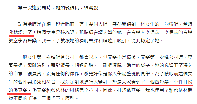 多年后他透露,早在孙燕姿读大学时,他就从一段合唱曲里pick到孙燕姿。待孙燕姿进华纳后,他又给她设计了短发的中性形象,并要求她不能留长发。