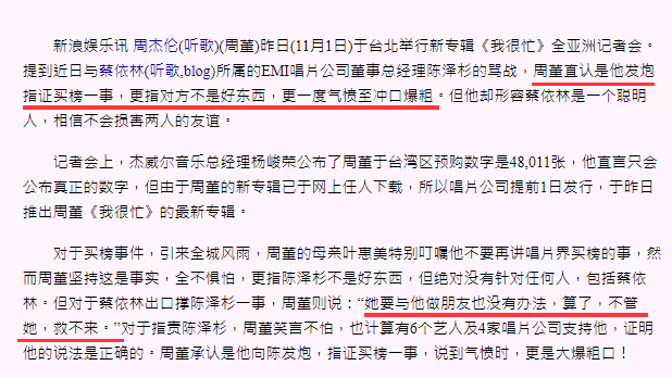 周杰伦听完更爆粗开骂,直截了当说陈泽杉买榜,还说蔡依林“要与他做朋友也没有办法,算了不管她,救不来”。