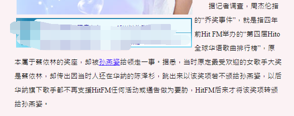 为此周杰伦不惜爆出当年的“乔奖”事件,指四年前蔡依林本来可以拿最受欢迎女歌手奖,陈泽杉却跳出来说不颁奖给孙燕姿,华纳旗下艺人都不再参加该主办方活动,无奈主办方只能把奖给孙燕姿。