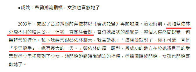 当时蔡依林已经过档索尼,陈泽杉却经常关心这位昔日爱徒,继续当她的“幕后军师”,他告诉蔡依林,“少男杀手”总会长大,想让女孩子也喜欢自己,必须转型当潮流偶像。