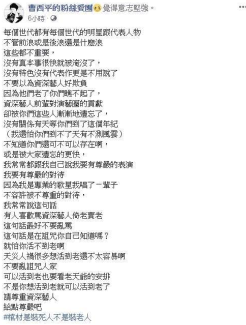 比如提到“老艺人”,他说:“什么老艺人老妖精老蟑螂,你家没老人你家没死人?”