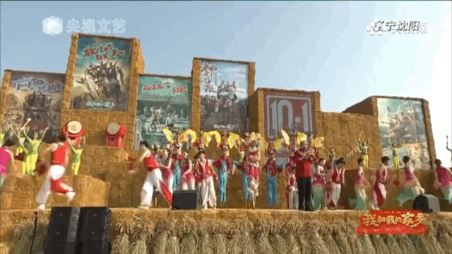 到处挂起红灯笼,传统大鼓被摆放在两旁,掰下的玉米棒子,沿着舞台边排成一队,一派喜庆热闹的景象。