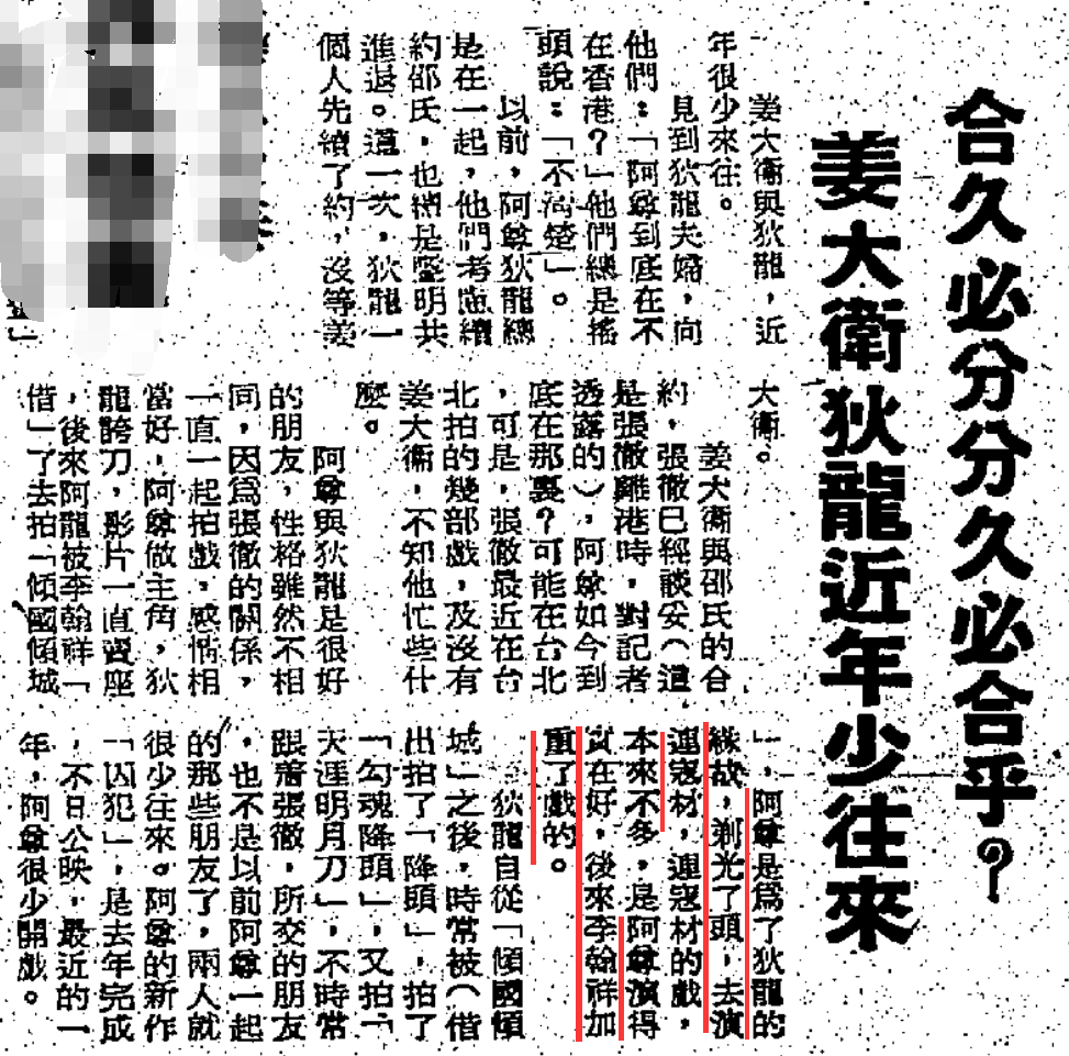 不是后来的网友YY,1976年的报章已写过俩人因为《倾国倾城》“合久必分”,后续是,之后狄龙有了更多被“借”走拍戏的机会,朋友圈也不只是小姜那批人了。
