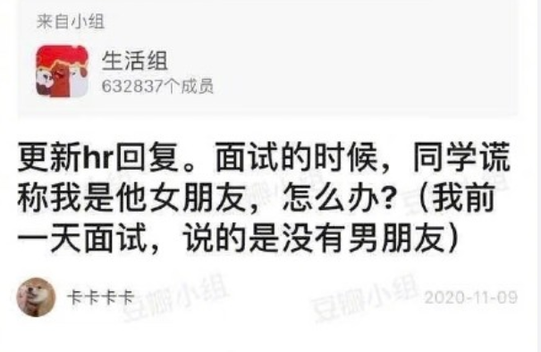 正当大家在讨论帖子真伪的时候,豆瓣小组有女生发帖求助,说自己面试时,同学谎称自己是他女朋友,原因是为了提高录用可能性。