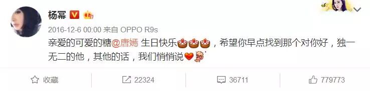 2016年12月唐嫣生日,杨幂照常发微博为其庆生,还希望她早日找到那个独一无二的他。