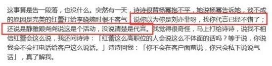 但后来蔡艺侬却从刘诗诗口中得知,杨幂称之所以没有合作,是因为蔡艺侬公司的人和杨幂公司的人放话,说:“你以为你是刘亦菲呀,找你代言已经不错了。”