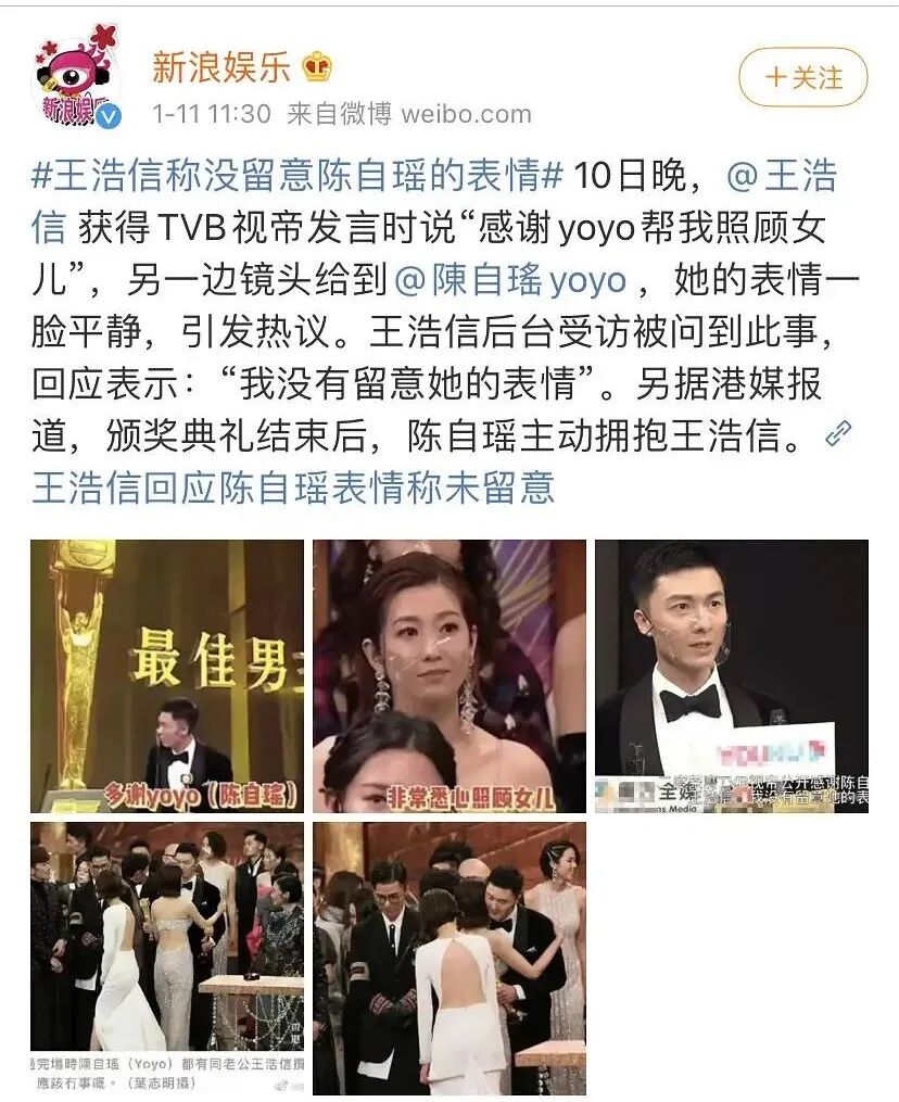 在后台采访时,有记者问到王浩信此事,他表示自己没有留意到太太的表情。