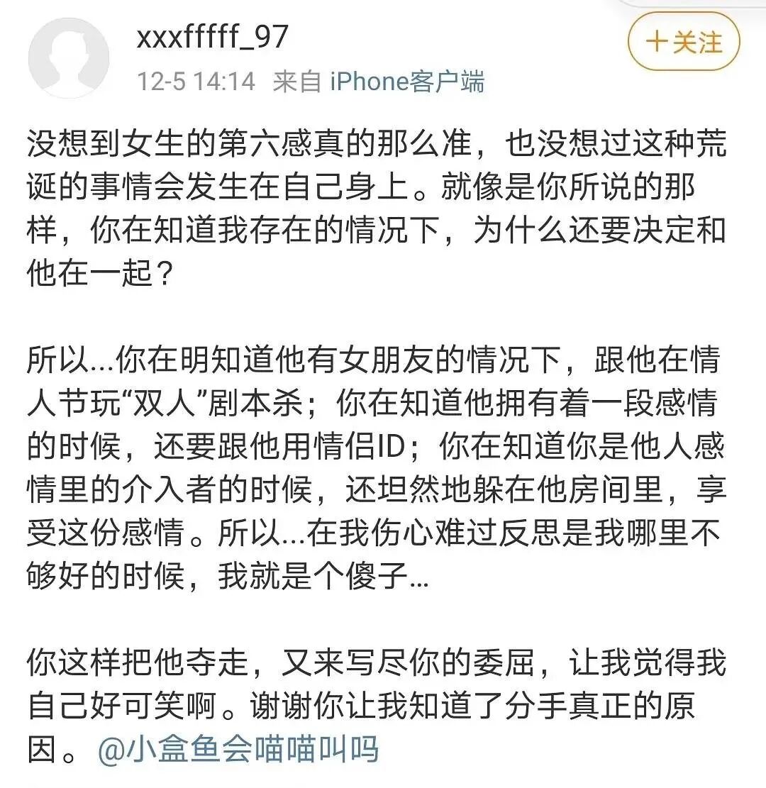 而焉栩嘉女友小盒鱼则多管齐下,小论文+亲密照妥妥的雷神之锤,称焉栩嘉不仅冷暴力还脚踏几条船,追求她时还和前女友不清不楚。