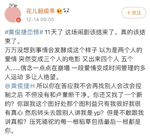 因为黄俊捷被拍到和别的女子同游,“花儿超级乖”微博发文表示自己被绿,还放了两人的聊天记录。