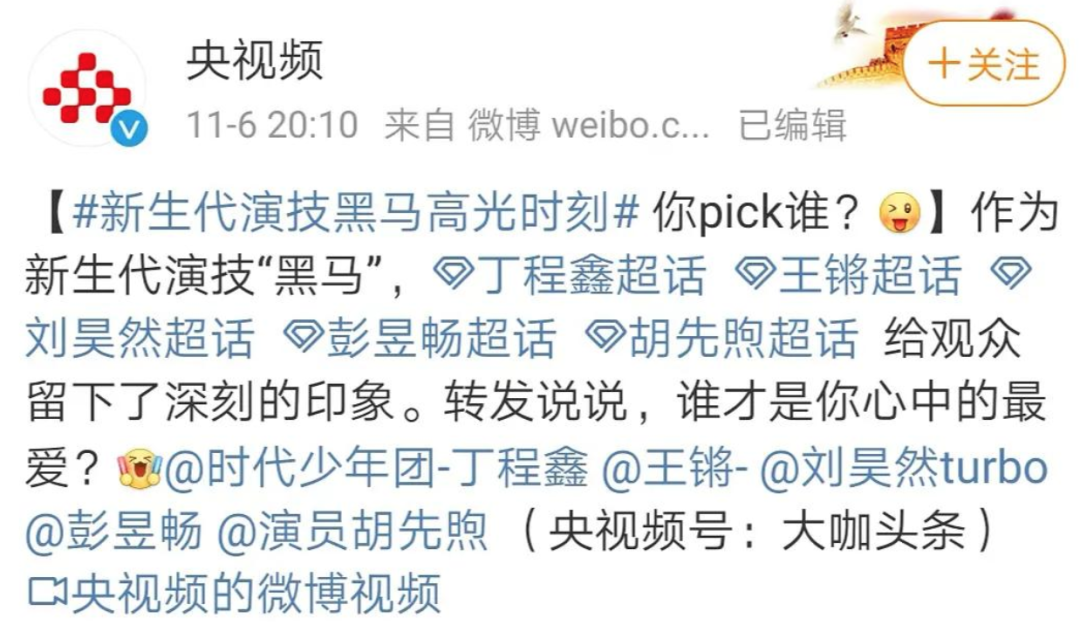 央视也把他放入“新生代演技黑马”的盘点之中。和他一起盘点的是刘昊然、王锵、彭昱畅、胡先煦,对于目前还没有影视剧大代表作的小丁来说,这评价挺高。