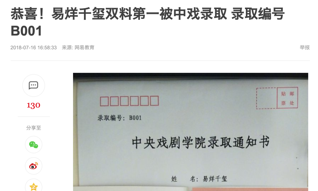 而他自己也有意朝着演员方向发展,大学考的是中戏。2018年,以双料第一的好成绩被中戏录取。