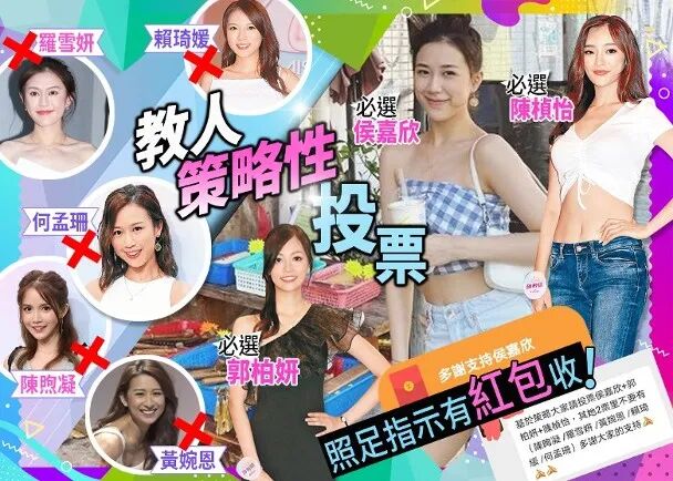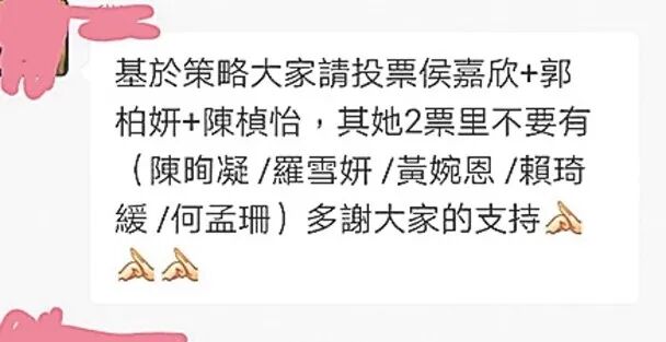 除此之外,群组中更是有人分析了此次参选的情况,还因此策划了一个投票指引,当中有铁粉留言表示基于策略,呼吁大家把手中五票先投给侯嘉欣,其余两票则不要投给侯嘉欣的劲敌,很明显是了解到郭柏妍及陈桢怡有得输,侯嘉欣要争入前三名就要胜过同级对手。