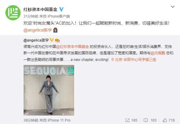 离开了《VOGUE服饰与美容》主编职位的张宇,则华丽转身投入资本领域,在2021年2月她加入了红杉资本中国基金,成为投资合伙人,专注时装、生活、娱乐消费界的投资发展。