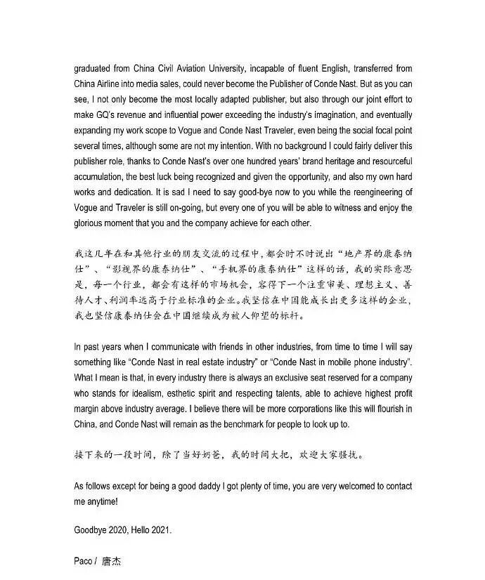 离开是离开了,但前公司的瓜他还是要吃。就在去年,《GQ》的运营总监唐杰发了一封辞职信。