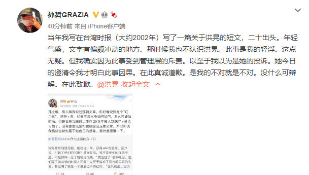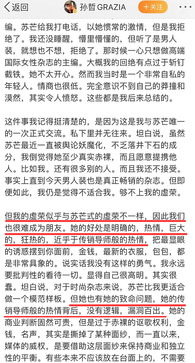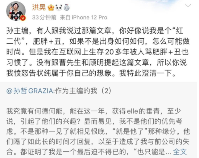 孙哲的小作文不止于此,还顺便扯出了一个(gua),称自己在Elle的继任者晓雪是从洪晃旗下的ilook杂志来的,签署过一个竞业协议,所以她需要赔钱给洪晃……