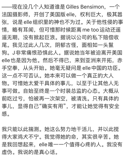 他还提到,EllE当时的主编张宇在筹备vogue,“诱发了之后不停歇的人事变动”;《时尚先生》由后来加入GQ杂志的王锋接手,自己离开EllE后,晓雪执掌这本杂志。