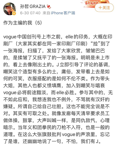 在孙哲的小作文里,提到Vogue中国创刊号上市之前,Elle是看不起对方的,拿到人家的印刷海报,也要嘲笑人家有多土……