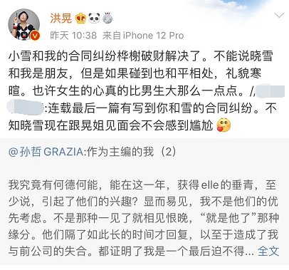 对此洪晃也回应了,说自己和晓雪的合同纠纷解决了,两人不是朋友,但如果碰到也能和平相处,礼貌寒暄。