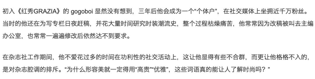 说起《红秀GRAZIA》,号称宇宙第一博主的gogoboi就是从那出来的。Gogoboi在红秀工作期间,每天写专栏日夜赶稿,还会因为稿子达不到要求被叫去主编办公室。