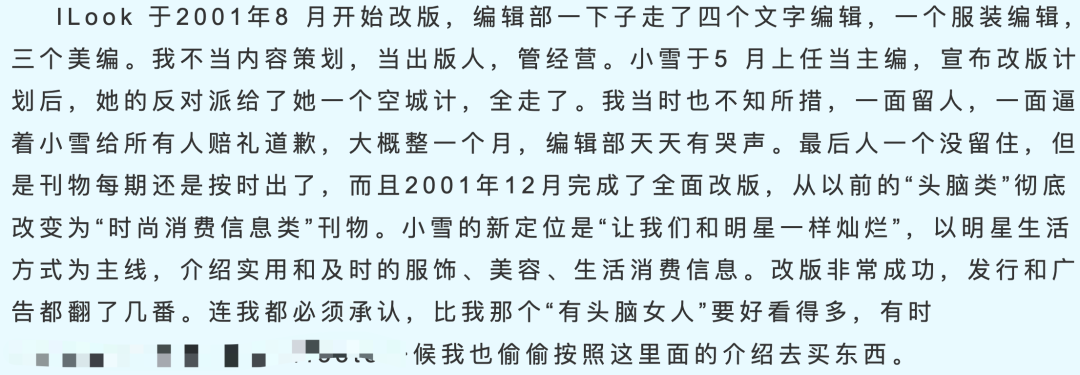 当年洪晃创办了《世界都市iLOOK》,晓雪则是《iLOOK》的主编。