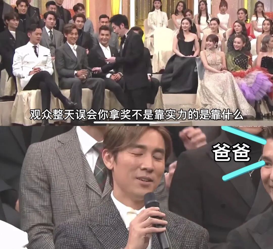 但你看,另一边的张智霖就不太高兴了,他的“最受欢迎男角色”是全民投票拿下的,于是得奖时他说:“这是不是代表TVB不喜欢我呢?为什么全民投票我才拿到这个奖?其实我想说,亲生仔固然可爱,但还有一种仔女也很可爱,就是你需要他的时候他会及时出现,就是义气仔女”……