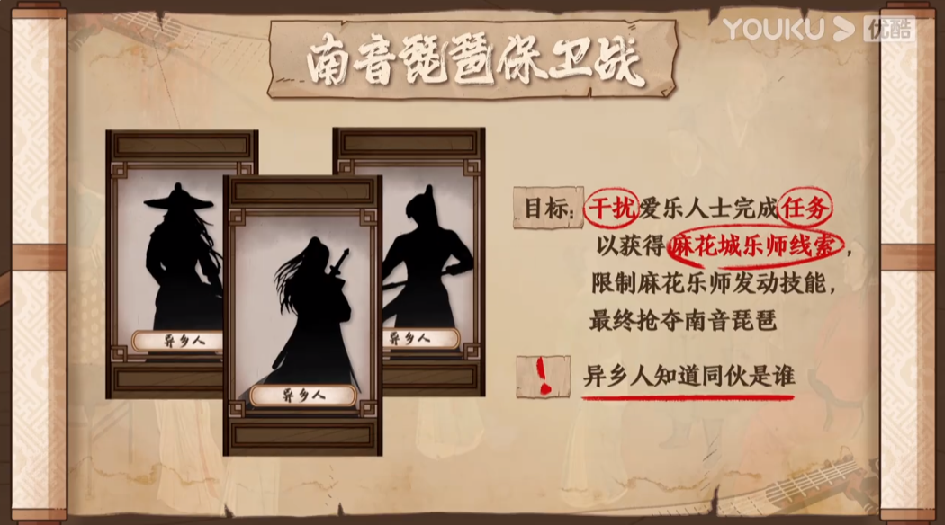 他们为了守卫南音琵琶,需要从九个人里找出3个异乡人,剩下的6个人里则有一个药师和乐师这样的“神牌”职位。我一琢磨,这不就是狼人杀的标准设置吗?