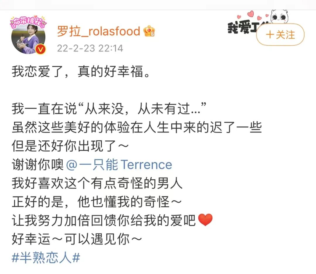 先说开头提到的巴啦啦能量,是前不久完结的恋综《半熟恋人》产出的最成功的cp。