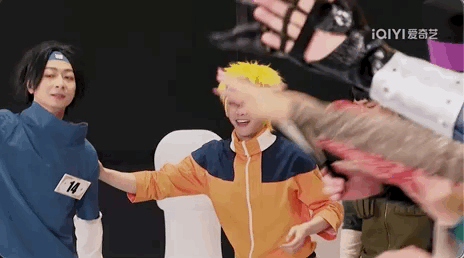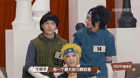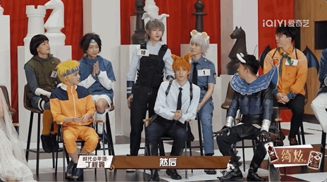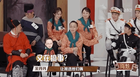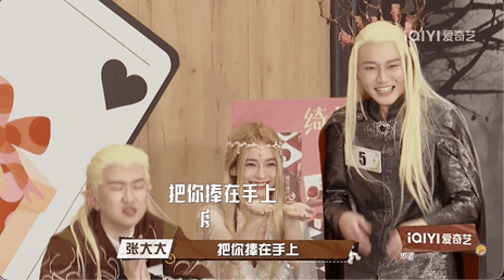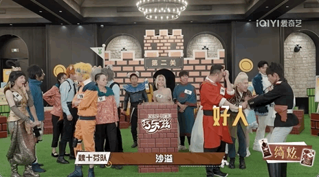 猜歌游戏,本来很简单,但节目整个玩出了团建的感觉,前奏一出,艺人纷纷上前抢着“举手”……再加上每组千奇百怪的cos服装,一眼望过去简直相当凌乱。