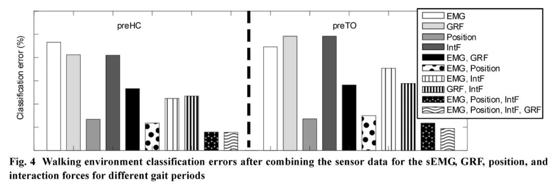 摘 要:在外骨骼机器人控制研究中,识别及预测操作者运动意图是一项很大挑战。外骨骼机器人是一种检测和驱动人体运动的机械动力装置,因其复杂的人机交互技术,需要使用很多不同类型传感器。当使用各种传感器时,需要选择数据类型以进行有效传感。肌电信号能在实际运动做出之前识别预期动作,并且可以缩短外骨骼机器人控制中的时间延迟。为应用下肢外骨骼帮助行走,本文工作旨在使用不同类型传感器(包括表面肌电信号传感器)识别行走环境和区分步态周期。为此,将地面反作用力、人机相互作用力、位置传感器和表面肌电信号传感器相结合,对4个受试者进行步态实验。本文展示了在行走环境与步态周期的识别中使用表面肌电信号及其他类型传感器的实验成果。选择不同传感器类型组合、表面肌电信号传感器不同位置组合以及表面肌电信号不同特征值组合,作为有效数据类型。实验结果表明,与使用单个力学传感器相比,将表面肌电信号传感器与其结合使用,可使识别结果得到很大改善。此外,在3种不同类型传感器的不同组合中,使用表面肌电信号与位置传感器信息的组合得出最高分类准确率。当使用全部4种类型传感器时,行走环境与步态周期分类准确率分别为96.1%与97.8%。在腿部5个表面肌电传感器不同位置组合里,股内侧肌和腓肠肌组合是最有效的2种肌肉类型组合。当仅使用表面肌电信号进行分类时,该组合在行走环境识别实验中,足跟接地前与足趾离地前的情况下,分类准确率分别为74.4%与71.7%;步态周期分类准确率为68%。两组有效的表面肌电信号特征值组合分别是“平均绝对值、过零点数”与“平均绝对值、波形长度”。“平均绝对值、过零点书”特征组合在行走环境识别实验中,在足跟接地前与足趾离地前情况下,分类准确率分别为80%与77.1%;步态周期分类准确率为75.5%。上述结果表明,表面肌电信号可有效用于控制外骨骼机器人。