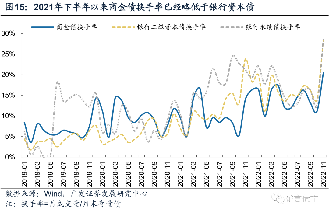 另一方面,2021下半年以来,随着资产荒下银行资本债品种被挖掘,其流动性也在逐步改善,商金债的换手率已经略低于同期的银行资本债。2021下半年以来,银行资本债换手率大幅提升,2021年11月-2022年1月甚至达到20%左右。2022年2月以来换手率虽有所下降,但总体多保持在15%以上。而同期商金债换手率提升不多,2022年多在15%左右,略低于同期的银行资本债,不过仍属于流动性偏强的品种。2022年11月,市场调整背景下银行二级资本债和银行永续债的换手率从10月的14%、13%提高至28%、29%,商金债从11%提高至20%,可能说明商金债被抛售的规模并不大。
