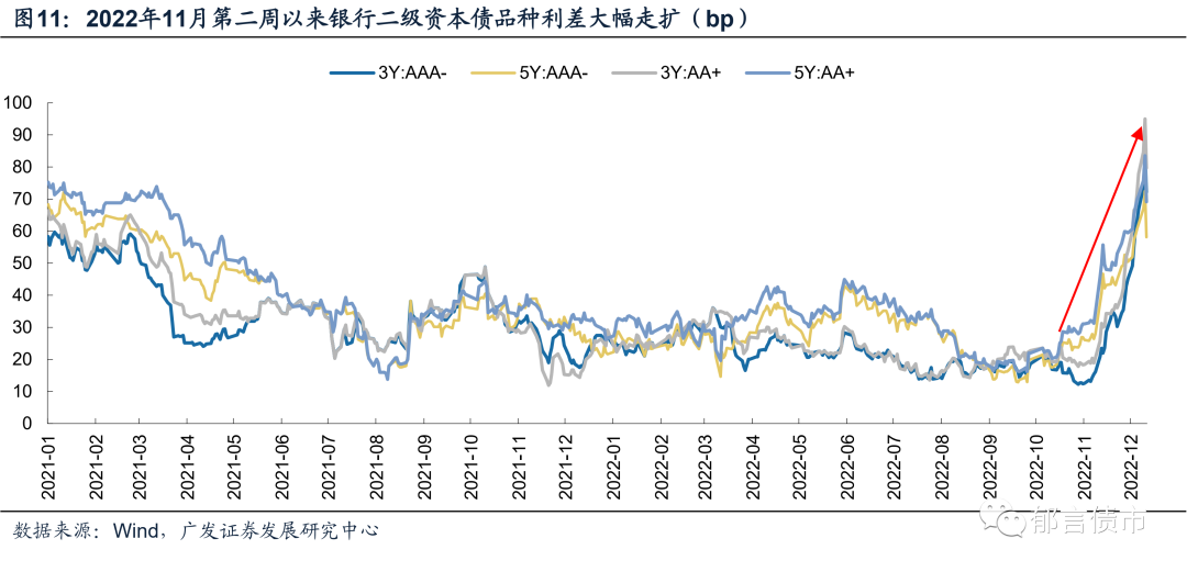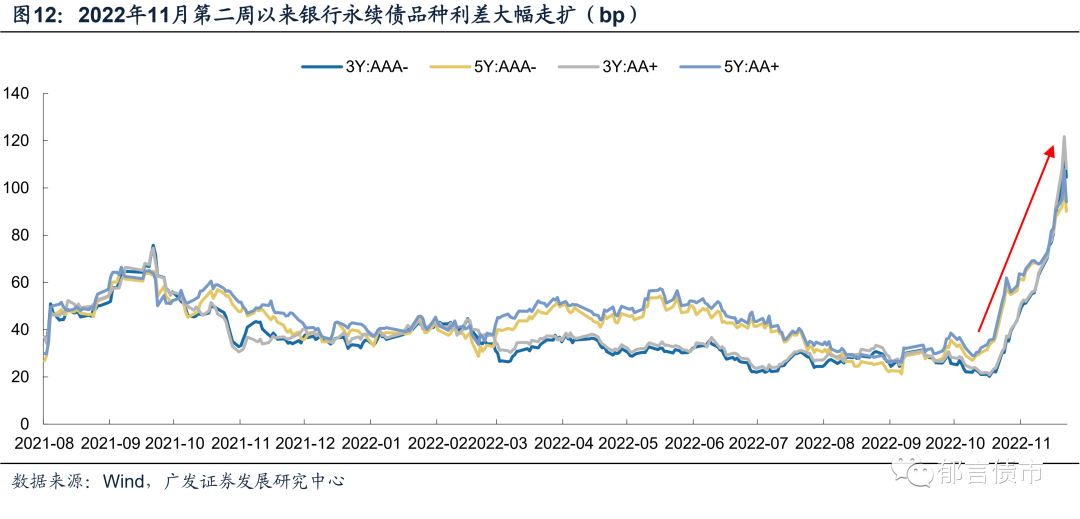 相比银行资本债,在11月以来的债市大幅调整过程中,商金债明显受影响更小。截至2022年12月14日,商金债到期收益率相较2022年11月10日上行44-56bp,而同期银行资本债到期收益率上行78-146bp,导致银行二级资本债和银行永续债相对商金债的品种利差大幅走扩。其中3年期中高等级银行二级资本债品种利差走扩57-61bp,5年期银行二级资本债走扩32-38bp,3年期银行永续债走扩82-85bp,5年期银行永续债走扩55-58bp。目前,银行资本债品种利差均处于2021年以来的历史高位。