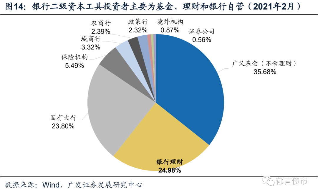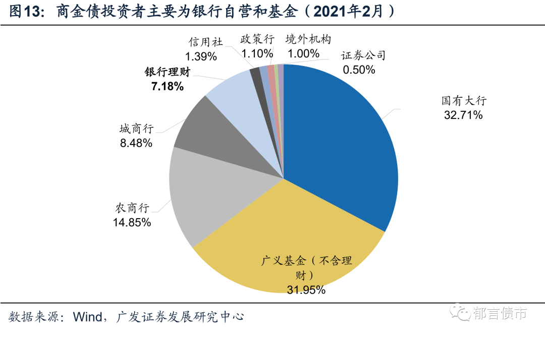 根据Wind中债债券托管数据,截至2021年2月,商金债的投资者主要是银行自营和基金,其中国有大行、城商行、农商行合计托管规模占比达到56%,其次是广义基金(不含银行理财),占比为32%,银行理财持有规模占比仅有7%。而银行二级资本债的投资者主要是负债端不稳定的基金和银行理财,持仓占比分别为36%、25%,银行自营持仓约30%。银行永续债来说,银行自营持有银行永续债的风险权重较高(多记作股权,250%风险权重),因此银行自营较少投资银行永续债,理财和基金持仓规模占比可能相较银行二级资本债更大。