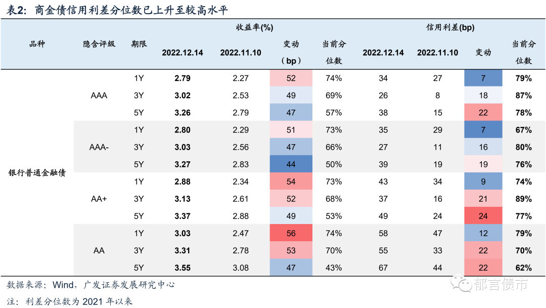 2022年7-8月,由于基本面承压,货币政策持续宽松,债券市场收益率从震荡逐步转向下行,期间商金债收益率下行20-30bp左右。2022年9-10月,债市进入低资金利率环境,流动性保持宽松,商金债收益率整体窄幅震荡。2022年11月第二周以来,资本面收紧,叠加疫情政策优化和地产融资政策放松,债市大幅回调,商金债收益率整体上行45-55bp左右,收益率绝对数已高于年初水平。