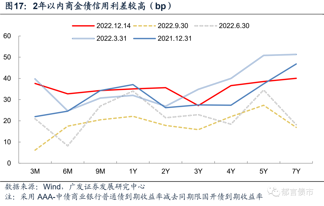 从期限来看,目前商金债收益率曲线相较之前被明显压平,2年以内商金债信用利差也处于较高水平,相对性价比更高。相较2021年末以及2022年前三季度末,短久期商金债收益率明显抬升,而中长久期收益率调整较少,导致商金债收益率曲线被明显压平。并且目前2年以内商金债信用利差也均处于较高水平,性价比更高。