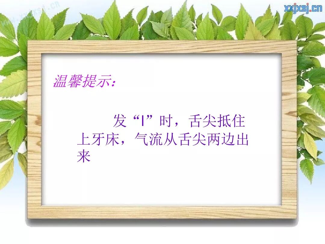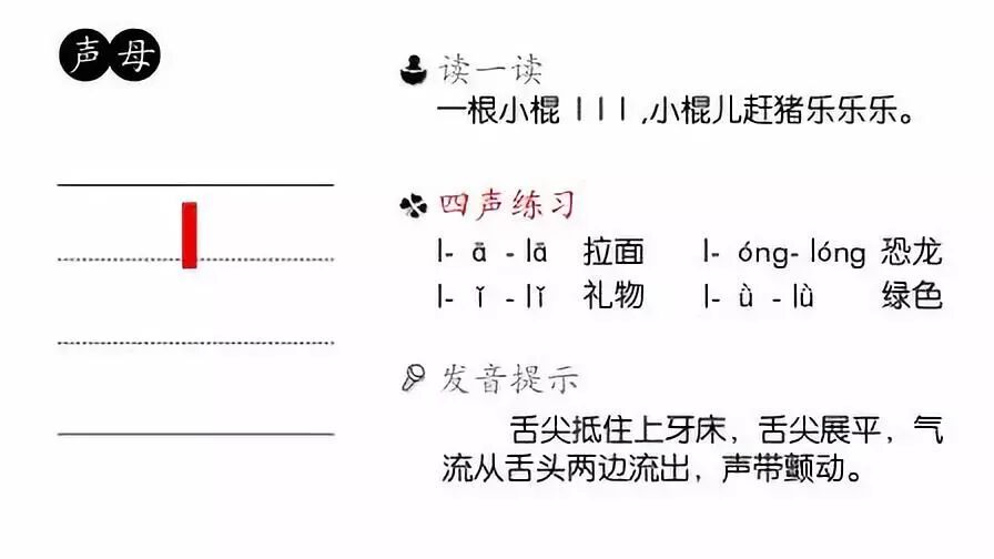 声母l为舌尖中浊边音,发音时舌尖抵住上齿龈,软腭上升,堵塞鼻腔通路,气流振动声带,从舌头两边流出。