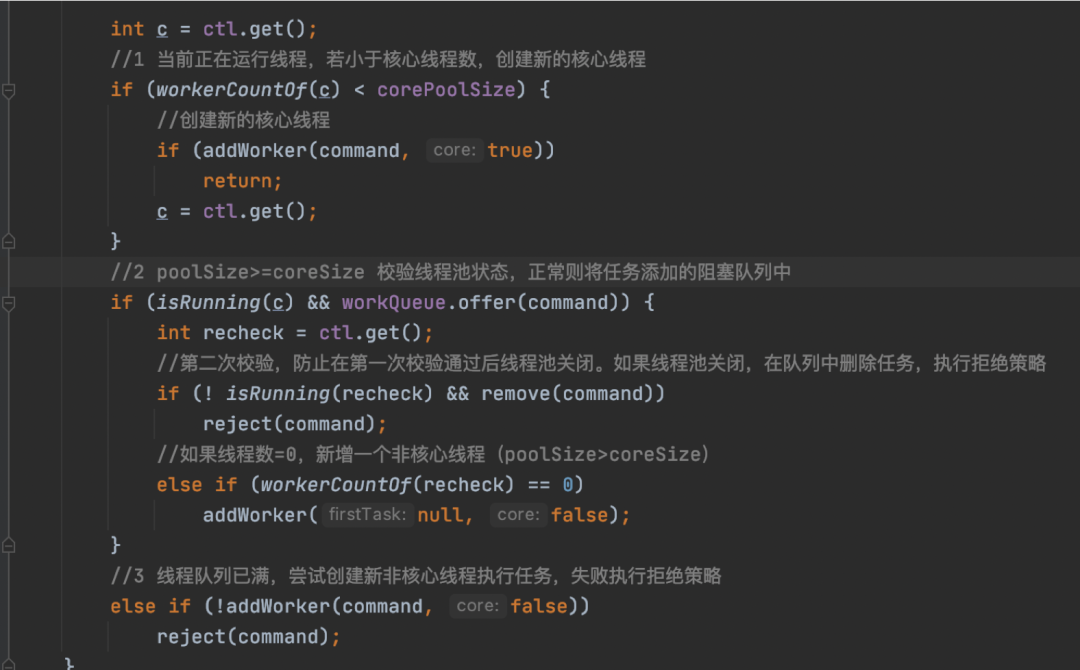 1 、当提交一个任务到线程池时,若线程数量 < corePoolSize,线程池会创建一个新线程放入workers(一个HashSet)中执行任务, 即使其他空闲的基本线程能够执行新任务也还是会创建新线程,直至达到corePoolSize。