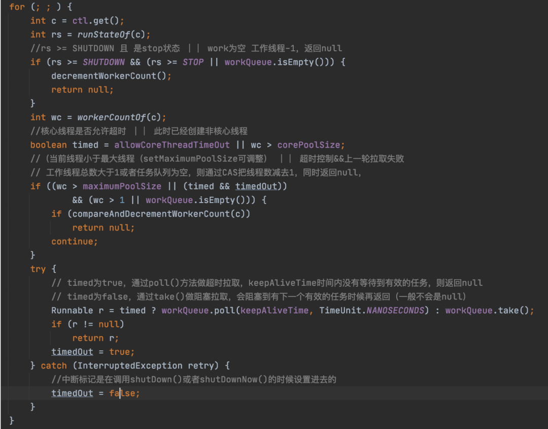 从队列取任务的地方,默认情况下,根据工作线程数量与核心数量的关系判断使用队列的poll()还是take()方法,keepAliveTime参数也是在这里使用的。